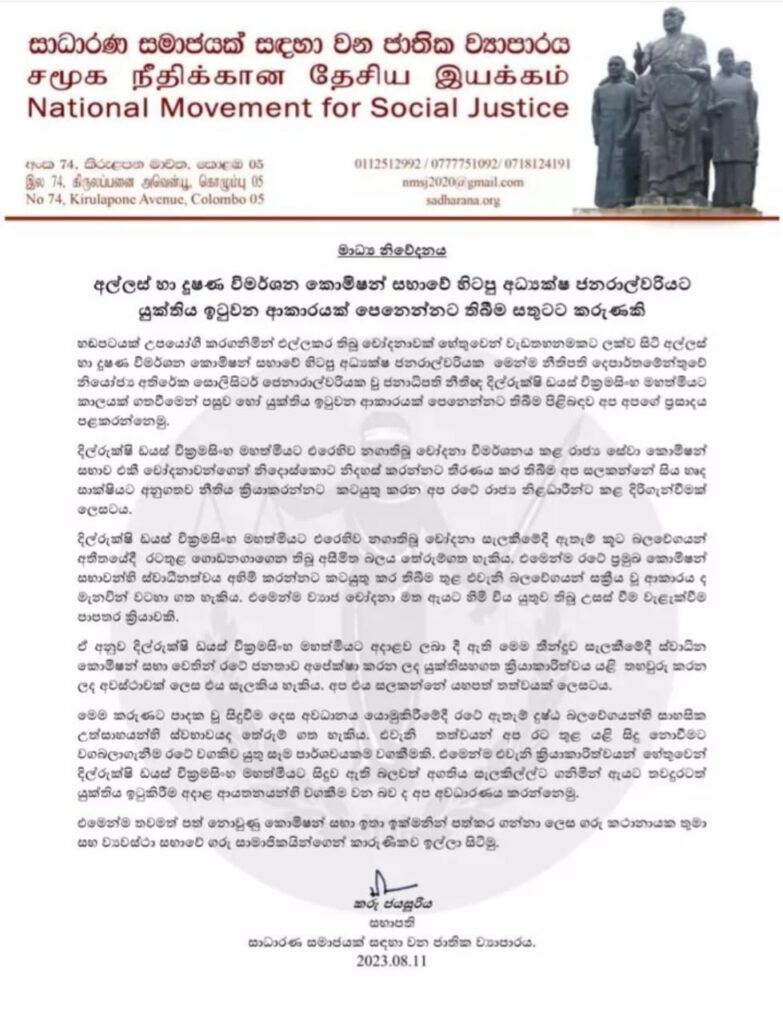 අල්ලස් හා දූෂණ විමර්ශන කොමිෂන් සභාවේ හිටපු අධ්යක්ෂ ජනරාල්වරියට යුක්තිය ඉටුවන ආකාරයක් පෙනෙන්නට තිබීම තමා සතුටු වන බව සාධාරණ සමාජයක් සඳහා වන ජාතික ව්යාපාරයේ සභාපති කරු ජයසූරිය මහතා මාධ්ය නිවේදනයක් නිකුත් කරමින් පවසයි .